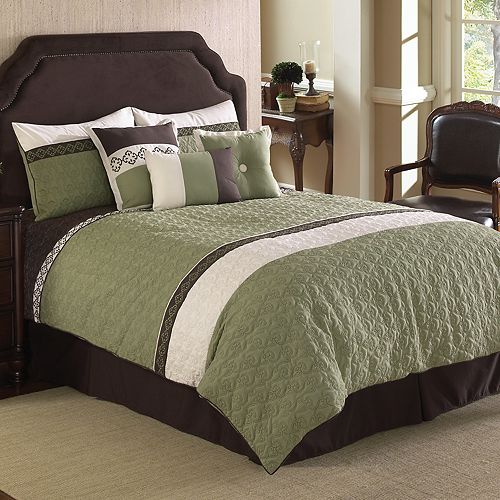 Bedding sets include comforter, pillow shams, euro shams, bedskirt, and three decorative cushions.